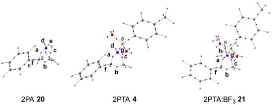 ωB97X-D/6-311G(d,p) ELF basin attractor positions, at 2PA 20, 2PTA 4, and the 2PTA:BF3 complex 21 in DCM. Letters a–h refer to the most relevant valence basins.
