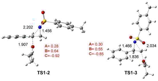 The GEDT [25] was computed at TS1-2 and TS1-3 in DCM to examine the changes in the electron density at these TSs. For this purpose, the atomic charges at the TSs were grouped into three frameworks: the ketone framework A, the ethylene framework B, and the sulfonamide framework C. The sums of the natural charges [38,39] for each framework are reported in Figure 2. The sulfonamide framework C exhibits notable negative charges by −0.92 and −0.85 e at TS1-2 and TS1-3, respectively, while the phenylethylene framework B is positively charged by 0.64 and 0.55 e. These data, analogous to those found in SN processes [23,24], suggest that the N1–C2 single bond in aziridine 2PTA 1 is already broken. This charge analysis also reveals the participation of the ketone A and sulfonamide C frameworks in stabilizing the central cationic phenylethylene framework B at the more favorable TS1-2 [28].