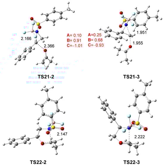 The stereoisomeric TS21-2’ and TS21-3’ associated with the ketone promoted aziridine ring-opening of the diastereomeric (1S,2R)-2PTA:BF3 complex 21 were also studied. The corresponding thermodynamic data are given in Table S2, while the TS geometries are given in Figure S3 in the Supplementary Material. These diastereomeric TSs are 1.00 and 0.11 kcal·mol−1 higher in enthalpy than their (1R,2R) counterparts, TS21-2 and TS21-3, respectively. After passing TS21-2’ and TS21-3’, the resulting intermediates are conformers of those obtained via TS21-2 and TS21-3 as a consequence of the loss of the chiral character of the aziridine N1 nitrogen atom.