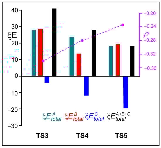 Figure 7 presents a graphical representation of the ξ total energies of the A, B, and C frameworks at the three TSs, depicted in green, red, and blue, respectively. The ξ total energies, shown in black, correspond to the RIAE activation energies of these aziridine ring-opening processes. The GEDT values at the sulfonyl aziridine framework are shown in pink. Several important conclusions can be drawn from the graphical trends displayed in Figure 7: (i) The unfavorable ξ total energies associated with the ketone A framework decrease in the order TS3 > TS4 > TS5. In the same order, the positive charge on the ketone A framework, which acts as a nucleophile, also decreases. (ii) The presence of the LA markedly stabilizes the sulfonamide C framework. Accordingly, the favorable ξ total energies associated with the sulfonamide C framework increase in the opposite order, TS3 < TS4 < TS5, consistent with the increase in the negative charge on the sulfonamide C framework acting as the LG (see Table S5 in the Supplementary Material). (iii) The decrease in the GEDT from the ketone framework to the sulfonyl aziridine one with the increase in the acidic character of the LA results in the stabilization of the ketone framework, thus contributing to the decrease in the ξ total energies. Note that, in polar reactions, the nucleophiles are destabilized due to a loss of electron density. Finally, (iv) the decrease in the destabilization of the nucleophilic ketone A framework and the increase in the stabilization of the LG sulfonamide C framework, along with the analysis of the GEDT at these frameworks, suggests a shift in the mechanism of these ring-opening processes from an SN2-like to an SN1-like [28].