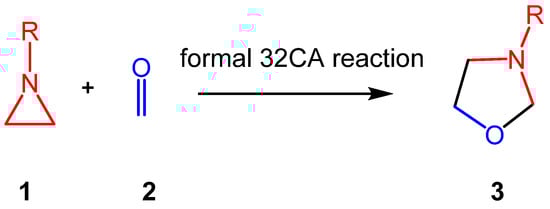 Aziridines constitute an important class of aza-three-membered heterocyclic compounds in organic synthesis, valued for their biological significance and remarkable synthetic versatility as multifunctional building blocks [17]. The structure of the simplest aziridine II is shown in Chart 1. Aziridines are commonly employed in the synthesis of oxazolidines I, acting as a three-atom-component in formal [3 + 2] cycloaddition (32CA) reactions with carbonyl compounds (see Scheme 1).