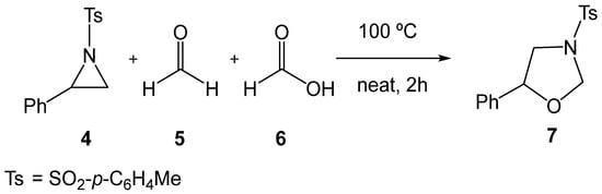 Several experimental studies have been reported on the synthesis of oxazolidines 3 through formal 32CA reactions of aziridines 1. In 2018, Majee et al. [18] reported the catalyst-free tandem ring-opening/ring-closing reaction of 2-phenyl-1-tosylaziridine (2PTA, 4) with formaldehyde 5 in the presence of formic acid 6, yielding the oxazolidine 7 (see Scheme 2). This catalyst-free reaction required heating at 100 °C to promote the opening of the aziridine ring.