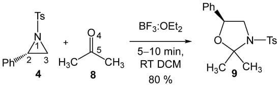 These formal 32CA reactions require the presence of Lewis acids (LAs) as a catalyst for the aziridine ring-opening step, allowing these tandem reactions to occur at room temperature (RT) and in short reaction times. Thus, Ghorai and Ghosh [19] explored the SN2-type ring-opening of 2PTA 4 with ketone 8 in the presence of BF3 as an LA catalyst, yielding, within a few minutes at RT in dichloromethane (DCM), the corresponding 1,3-oxazolidine 9 in 80% yield (see Scheme 3). This formal 32CA reaction was completely C2 regioselective and stereospecific.
