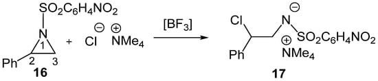 BF3 LA-catalyzed C2 regioselective aziridine ring-opening process of 2PNSA 16 by chloride anion Cl− in the presence of the counterion NMe4+.