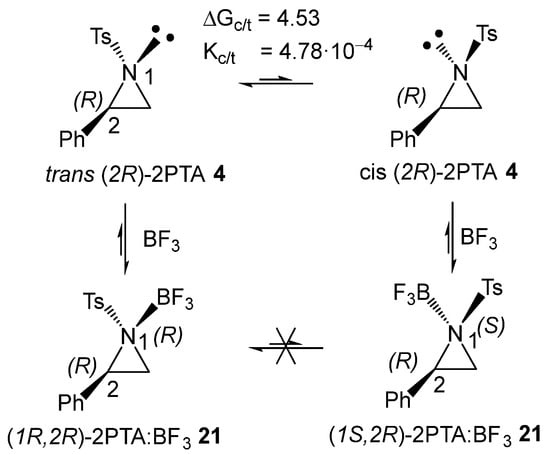 A comparison of the energetic and geometrical parameters of the diastereomeric (1R,2R) and (1S,2R) TSs indicates that the change in the N1 configuration of 2PTA:BF3 complex 21 does not cause significant changes in the mechanism of the LA-catalyzed aziridine ring-opening of 2PTA 4.