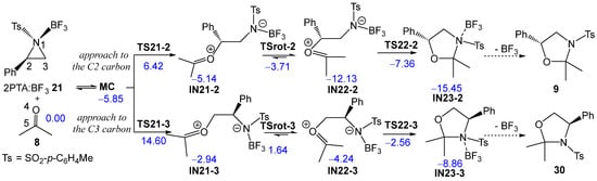 As shown in Scheme 9 and Figure 5, the approach of ketone 8 to the chiral C2 carbon of (1R,2R)-2PTA:BF3 complex 21 leads to an inversion of the configuration at the aziridine C2 carbon of the complex 21 relative to that present in the final oxazolidine 9 (see the experimental LA-catalyzed formal 32CA reaction shown in Scheme 3 and Scheme 4). This stereochemical outcome is classically associated with an SN2-type mechanism for aziridine ring-opening [19].