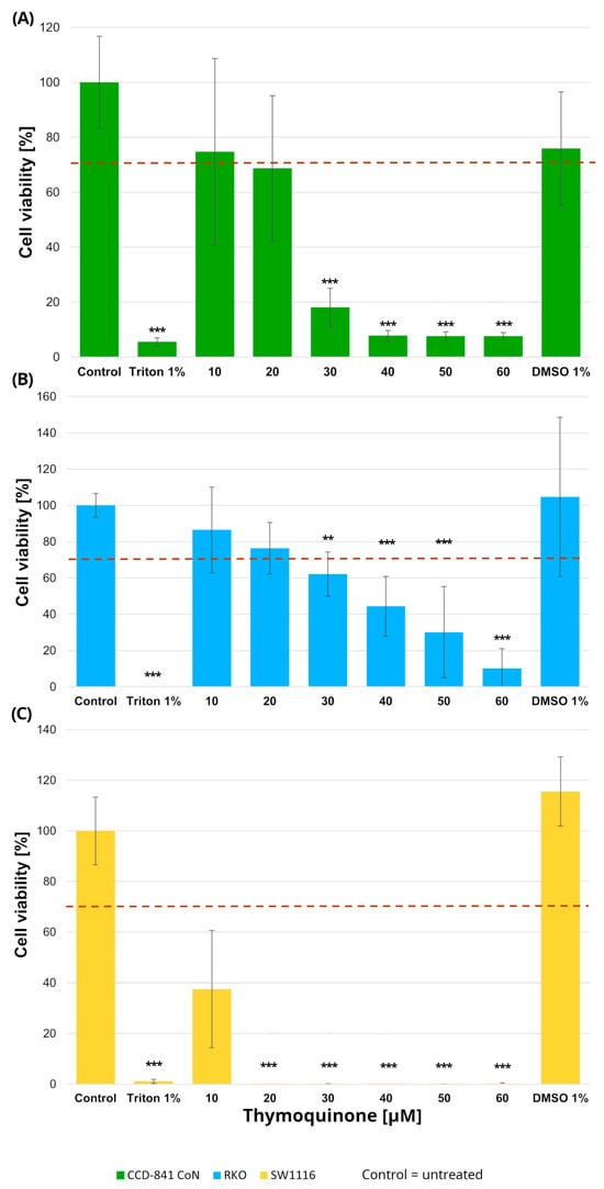 Cell viability of normal colon epithelial cells (CCD-841CoN; (A)) and colorectal cancer cell lines RKO (B) and SW1116 (C) following 24 h treatment with thymoquinone at increasing concentrations. Cell viability was assessed using the MTT assay and expressed as a percentage of the untreated control (set to 100%). Bars represent mean ± standard deviation (SD). The dashed horizontal line indicates the 70% viability threshold. Untreated cells served as the control, Triton X-100 (1%) was used as a positive cytotoxicity control, and DMSO (1%) served as the vehicle control corresponding to the highest solvent concentration applied. Statistical significance was evaluated using the Kruskal–Wallis one-way ANOVA followed by post hoc pairwise mean-rank comparisons; ** p < 0.01; *** p < 0.001 compared with the control. Three independent biological replicates were analyzed. Abbreviations: DMSO, dimethyl sulfoxide.