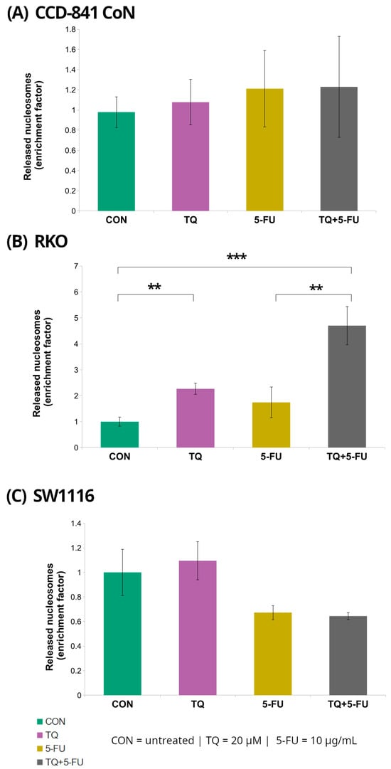 Enrichment of cytoplasmic mono- and oligonucleosomes in normal colon epithelial cells (CCD-841CoN; (A)) and colorectal cancer cell lines RKO (B) and SW1116 (C) following 24 h treatment with thymoquinone (TQ; 20 µM), 5-fluorouracil (5-FU; 10 µg/mL), or their combination. Nucleosome levels were quantified using the Cell Death Detection ELISA assay and expressed as an enrichment factor relative to the untreated control (set to 1.0). Bars represent mean ± standard deviation (SD). Statistical significance was assessed using the Kruskal–Wallis one-way ANOVA followed by post hoc pairwise mean-rank comparisons; statistically significant differences between the indicated treatment groups are shown by brackets (** p < 0.01; *** p < 0.001). Abbreviations: CON, control; TQ, thymoquinone; 5-FU, 5-fluorouracil.