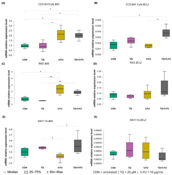 Expression levels of BAX and BCL2 in normal colon epithelial cells (CCD-841CoN) and colorectal cancer cell lines RKO and SW1116 following 24 h treatment with thymoquinone (TQ; 20 µM), 5-fluorouracil (5-FU; 10 µg/mL), or their combination. Panels (A,B) show BAX and BCL2 expression in CCD-841CoN cells, panels (C,D) depict expression in RKO cells, and panels (E,F) present expression in SW1116 cells. Box plots represent the interquartile range (IQR), with the horizontal line indicating the median and whiskers denoting values within 1.5× IQR. Statistical significance was assessed using the Kruskal–Wallis one-way ANOVA followed by post hoc pairwise mean-rank comparisons, statistically significant differences between groups are indicated by asterisks (* p < 0.05; ** p < 0.01). Data are derived from three biological replicates with three technical replicates per group. Abbreviations: CON, untreated control; TQ, thymoquinone; 5-FU, 5-fluorouracil.