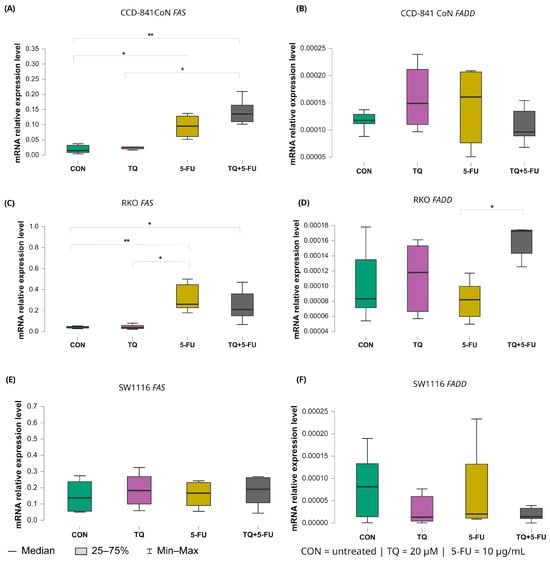 Expression levels of FAS and FADD in normal colon epithelial cells (CCD-841CoN) and colorectal cancer cell lines RKO and SW1116 following 24 h treatment with thymoquinone (TQ; 20 µM), 5-fluorouracil (5-FU; 10 µg/mL), or their combination. Panels (A,B) show FAS and FADD expression in CCD-841CoN cells, panels (C,D) depict expression in RKO cells, and panels (E,F) present expression in SW1116 cells. Box plots represent the interquartile range (IQR), with the horizontal line indicating the median and whiskers denoting values within 1.5× IQR. Statistical significance was assessed using the Kruskal–Wallis one-way ANOVA followed by post hoc pairwise mean-rank comparisons statistically significant differences between groups are indicated by asterisks (* p < 0.05; ** p < 0.01). Data are derived from three biological replicates with three technical replicates per group. Abbreviations: CON, untreated control; TQ, thymoquinone; 5-FU, 5-fluorouracil.