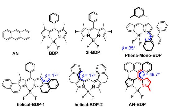 Molecular structures of the compound AN-BDP, and the recently reported twisted BODIPY derivatives showing ISC (Phena-Mono-BDP, helical-BDP-1 and helical-BDP-2) and reference compounds (AN, BDP and 2I-BDP). The colored part of AN-BDP shows the torsion of the molecule.