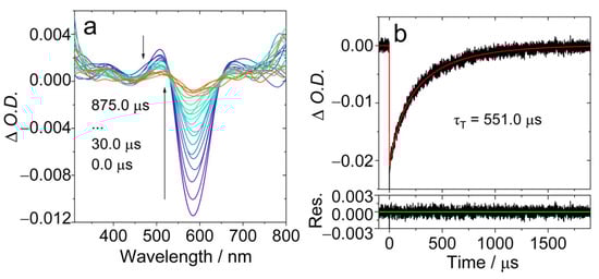 The ns-TA spectra of AN-BDP were studied (Figure 5). Upon pulsed laser excitation, a ground-state bleaching (GSB) band centered at 586 nm was observed, together with the weak excited state absorption (ESA) bands centered at 506 nm and 680 nm, respectively (Figure 5a). This profile may be due to the superposition of the GSB and the ESA bands, i.e., there is probably a broad ESA band in the range of 450 nm–700 nm. The ESA bands are similar to that of the native BDP [26]. The intrinsic triplet state lifetime was determined as 551.0 μs, based on a kinetics model with the TTA self-quenching effect considered in [53,55]. This lifetime is much longer than that of the triplet state of the native BDP (ca. 82 μs) [53] and helical-BDP-2 (197.5 μs) [57], but it is comparable to the recently reported twisted BODIPY (helical-BDP-1, 492 μs) [40].