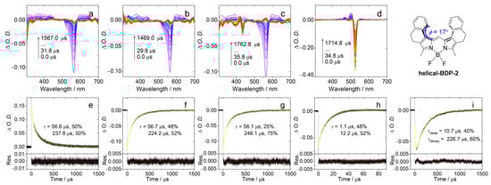 Nanosecond transient absorption spectra and decay traces in deaerated DCM. (a) Spectrum of helical-BDP-2 alone. (b–d) Spectra of helical-BDP-2 (triplet donor) in the presence of the triplet acceptors 9,10-Diphenylanthracene, Perylene, and PBI, respectively. (e–h) Corresponding decay traces monitored at 560 nm for conditions (a) to (d), respectively. (i) Decay trace at 505 nm for helical-BDP-2 with PBI. λex = 550 nm, c[donor] = 5.0 × 10−6 M, c[acceptor] = 2.0 × 10−5 M, 20 °C. The arrows in (a–d) indicate the evolution of the spectrum along with increasing of the delay time after laser flash.