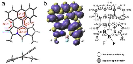 The geometry and the photophysical property of AN-BDP were studied in detail with theoretical computation. The optimized ground state geometry indicated a highly twisted molecular structure (Figure 9a). Both the fused anthryl and the BDP units are non-planar. The anthryl unit is twisted by 12.7°, whereas the puckered BDP unit is with torsion of 12°. The dihedral angle between the two units is 49.7°, whereas it is 8.0° on the other side of the fused structure (Figure 9a). These geometry detail was not reported in the previous literature [47], and it is drastically different from the analogue that the anthryl unit is fully fused with the BDP unit, the fully fused analogue takes a planar geometry [54]. The conformation of AN-BDP is also different from the recently reported anthryl-BODIPY dyads in which the two units are connected by one single C-C band [52,53,60].