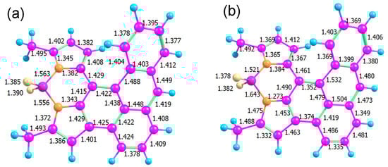 Bond lengths in the optimized structures of the electronic ground state S0 (a) and the conical intersection (b).