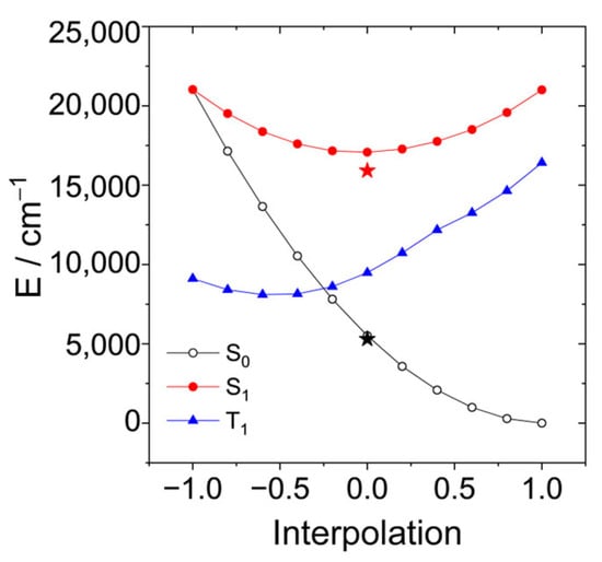 A linear interpolation between these structures yields the potential energy curves shown in Figure 13. The optimized energy of the S1 state and the corresponding energy of the ground state are shown as red and black stars. The FC-point is at the same energy as in the case when the increasing polarity of the solvent lowers the barrier. Although we do not find a vanishing barrier with this level of theory, the results provide an explanation that the radiation-less process becomes more efficient in more polar solvents. (Note that the transition from the S1 to the S0 state usually occurs when both states approach within the energy of a few vibrational quanta.) This can explain the absence of fluorescence and the missing triplet yield of AN-BDP.