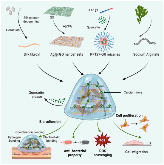 Schematic diagram of preparing biomedical hydrogels based on the synthesized silk fibroin (SF) and alginate, reinforced by silver-doped rGO (Ag@rGO) nanosheets. In addition, quercetin was loaded in PF-127 micelles for incorporation into hydrogels. The related properties of quercetin-released hydrogels, including adhesive ability, ROS scavenging, antibacterial activity, and cytocompatibility, were investigated.