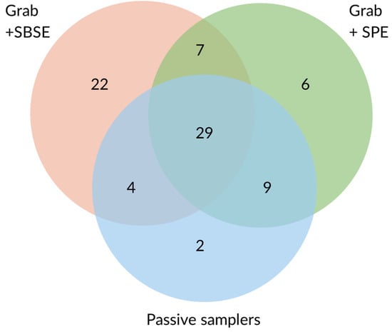 Ref. [35] reported a higher median Log Kow for pesticides detected by POCIS (4.6) than for those detected by Chemcatcher with SDB disks (3.2). No such difference was reported in our study, where the median Log Kow of the detected compounds was 3.7 for both techniques. The POCIS ideal polarity range is reported to be between 0 and 4 [40], while Chemcatcher SDB disks have been reported to extract compounds in the hydrophobicity range between 2 and 6 [41]. Chemcatcher HLB disks use the same absorbent material as POCIS and might therefore be more efficient in the extraction of semi-polar to polar compounds, while overcoming the possible POCIS solvent loss due to its bulky nature, which reduces the active sampling area [16]. The pesticide screen used in this study, which included compounds with median Log Kow values of 4.0 and where 75% of compounds had a log Kow > 3.4, could have played a role in the lower numbers of pesticides detected by passive samplers compared to grab samplers. Ultimately, various studies have confirmed the complementarity of POCIS and Chemcatcher in terms of types of pesticides detected [16,17,35], supporting the use of multiple passive samplers to increase the screening capacity. These first observations hint at a complementarity among SBSE- and SPE-extracted grab samplers and passive samplers. SBSE appears to extract more compounds at trace levels, while SPE and passive samplers extract compounds with a wider polarity, thanks to their common absorbent material (HLB).