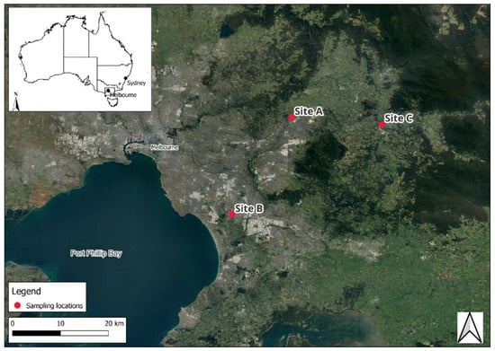 This study was conducted at three sampling sites in Victoria, south-eastern Australia. The sites, referred to as Site A, Site B, and Site C (Figure 3), were selected to represent distinct land uses, including a residential area downstream of a wastewater treatment plant outlet (Site A), an industrial urban residential neighbourhood (Site B), and a stream adjacent to horticultural and pastoral lands (Site C). Sample site coordinates can be consulted in Supplementary Table S1.