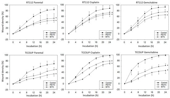 Influence of PEITC and BITC on wound closure from parental, cisplatin- and gemcitabine-resistant RT112 and TCCSup cells (compared to untreated controls). Values are shown as percentage related to 0% closure at zero time. * indicates significant difference to the untreated controls with p < 0.05 (n = 3).