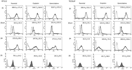 Integrin β subtype expression on parental, cisplatin- and gemcitabine-resistant RT112 and TCCSUP cells. Solid lines (β1, β1act, β4) and black filling (β5) show specific fluorescence; dashed line (β1, β1act, β4) and gray filling (β5) show isotype IgG1. The X-axis shows the relative fluorescence intensity (FL2-H) (given as relative logarithmic distribution), the Y-axis shows cell number (counts). Mean values +/−SD from n = 3 are shown in each set.