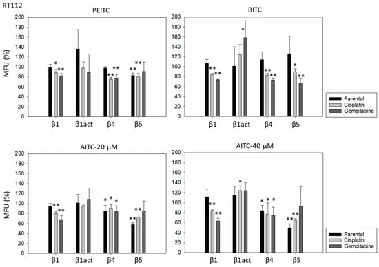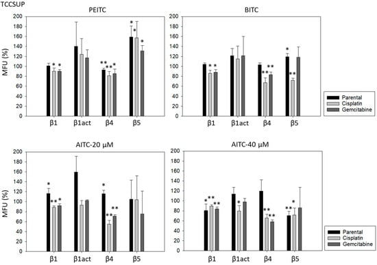 PEITC, BITC, and AITC diminished integrin β1 in both drug-resistant RT112 and TCCSUP cells (Figure 5). Additionally, 20 µM AITC slightly elevated integrin β1 in parental TCCSUP, but 40 µM AITC induced a reduction. Activated β1 was only altered by 40 µM AITC with an elevation in RT112 but a down-regulation in TCCSUP. All ITCs lowered integrin β4 in the drug-resistant cells (both RT112 and TCCSUP). Like integrin β1, β4 was slightly enhanced in parental TCCSUP by 20 µM AITC. Suppression of β4 was induced by 20 and 40 µM AITC in parental RT112. Integrin β5 was down-regulated in parental and cisplatin-resistant RT112 by PEITC and AITC, and down-regulated by BITC in cisplatin- and gemcitabine-resistant RT112. Different effects were seen in TCCSUP cells. PEITC evoked a significant increase in integrin β5 (all TCCSUP sublines). Integrin β5 was also elevated in the parental cells by BITC. Loss of this integrin type was only observed in cisplatin-resistant TCCSup by BITC and 40 µM AITC, and in parental TCCSUP by 40 µM AITC.