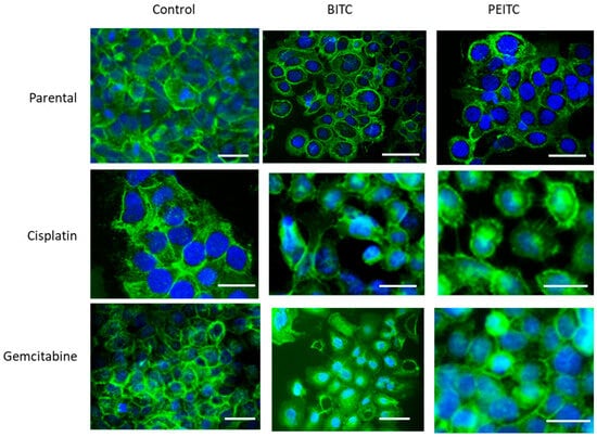 No significant alterations in CD44s or CD44v expression were found in RT112 und TCCSUP (parental and resistant cells) following BITC, AITC, or PEITC exposure. However, CD44s receptor translocation was observed in RT112 cells by fluorescence microscopy. CD44s was particularly visible along the cell surface of the untreated control cells. Membranous accumulation was also observed when parental RT112 was treated with BITC or PEITC. However, CD44s was enriched in the cell cytoplasm following BITC or PEITC exposure to cisplatin- or gemcitabine-resistant RT112 (Figure 7).