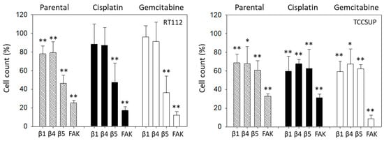 Resistance was induced by exposing sensitive cells to either cisplatin or gemcitabine in increasing concentrations, up to a final dosage of 1 µg/mL (cisplatin—all cell lines) or 10 ng/mL (gemcitabine-TCCSUP), or 20 ng/mL (gemcitabine-T24, RT112) [29]. Resistance was verified as previously described [70]. Drug-associated toxic effects were determined by the trypan blue exclusion test (Gibco/Invitrogen). All investigations were based on comparing the behavior of drug-sensitive cells (termed parental cells) to that of drug-resistant cells.