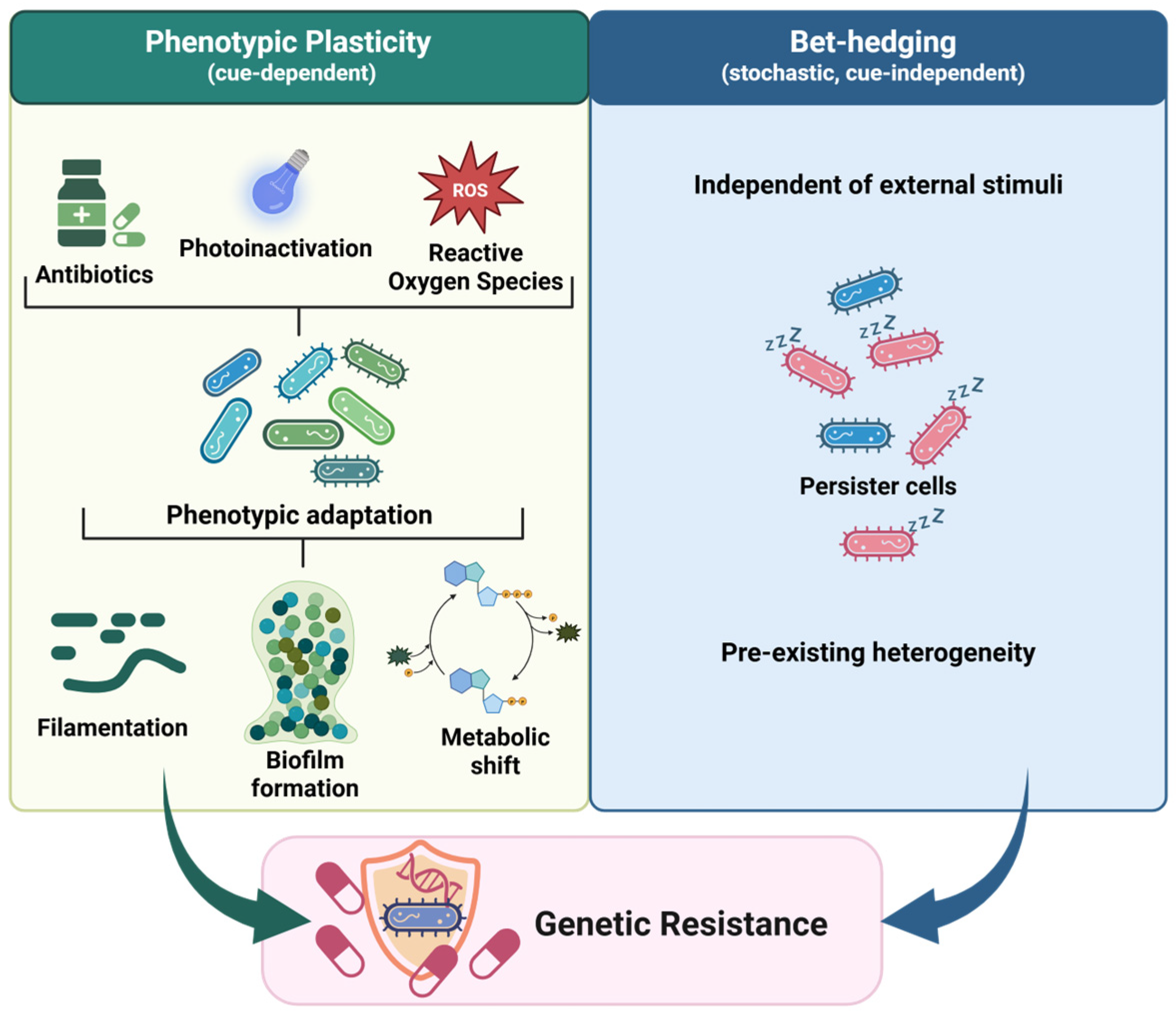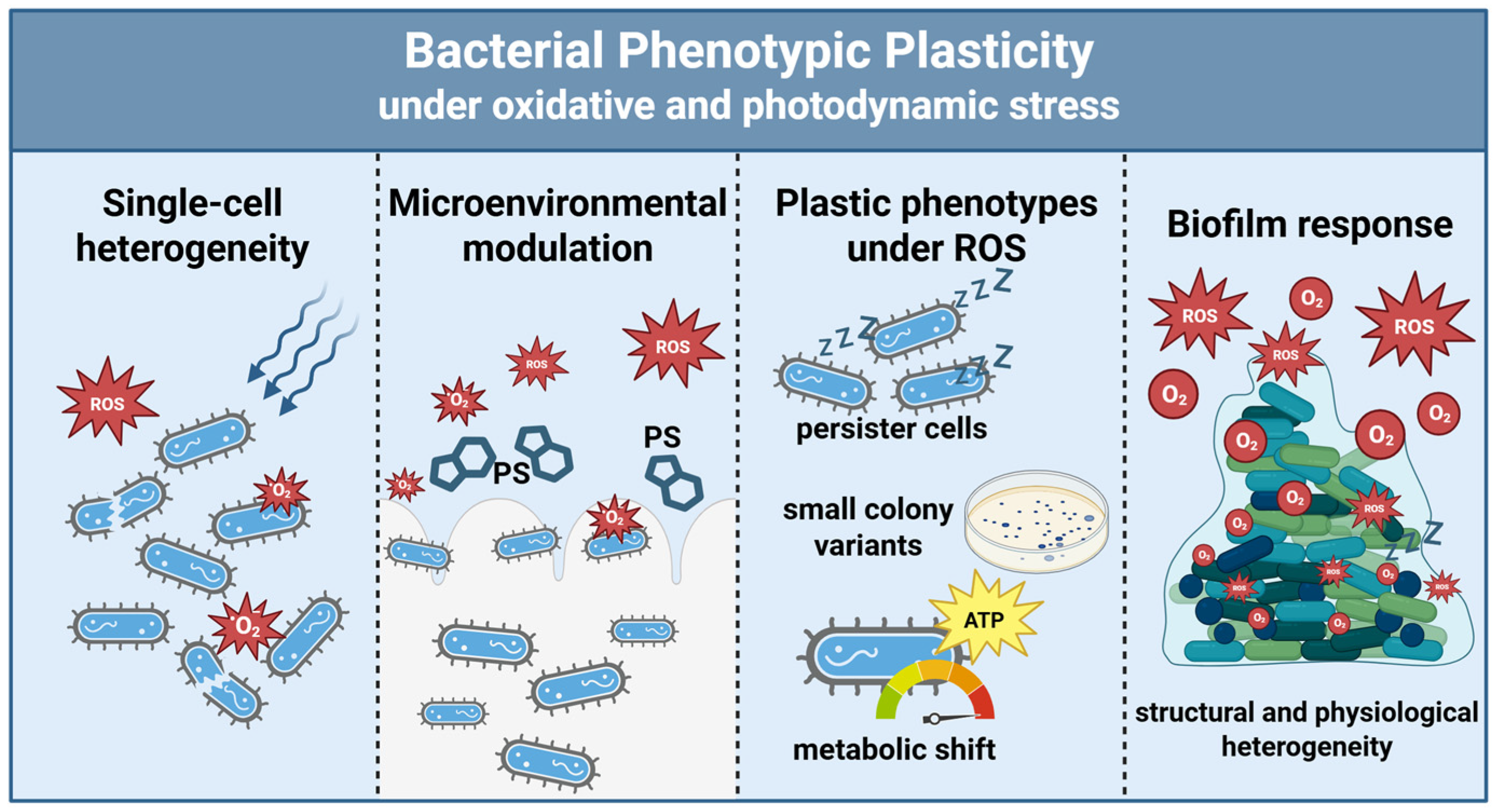 Rapacka-Zdonczyk, A. Beyond Resistance: Phenotypic Plasticity in Bacterial Responses to Antibiotics, Oxidative Stress and Antimicrobial Photodynamic Inactivation. Molecules 2026, 31, 567. https://doi.org/10.3390/molecules31030567