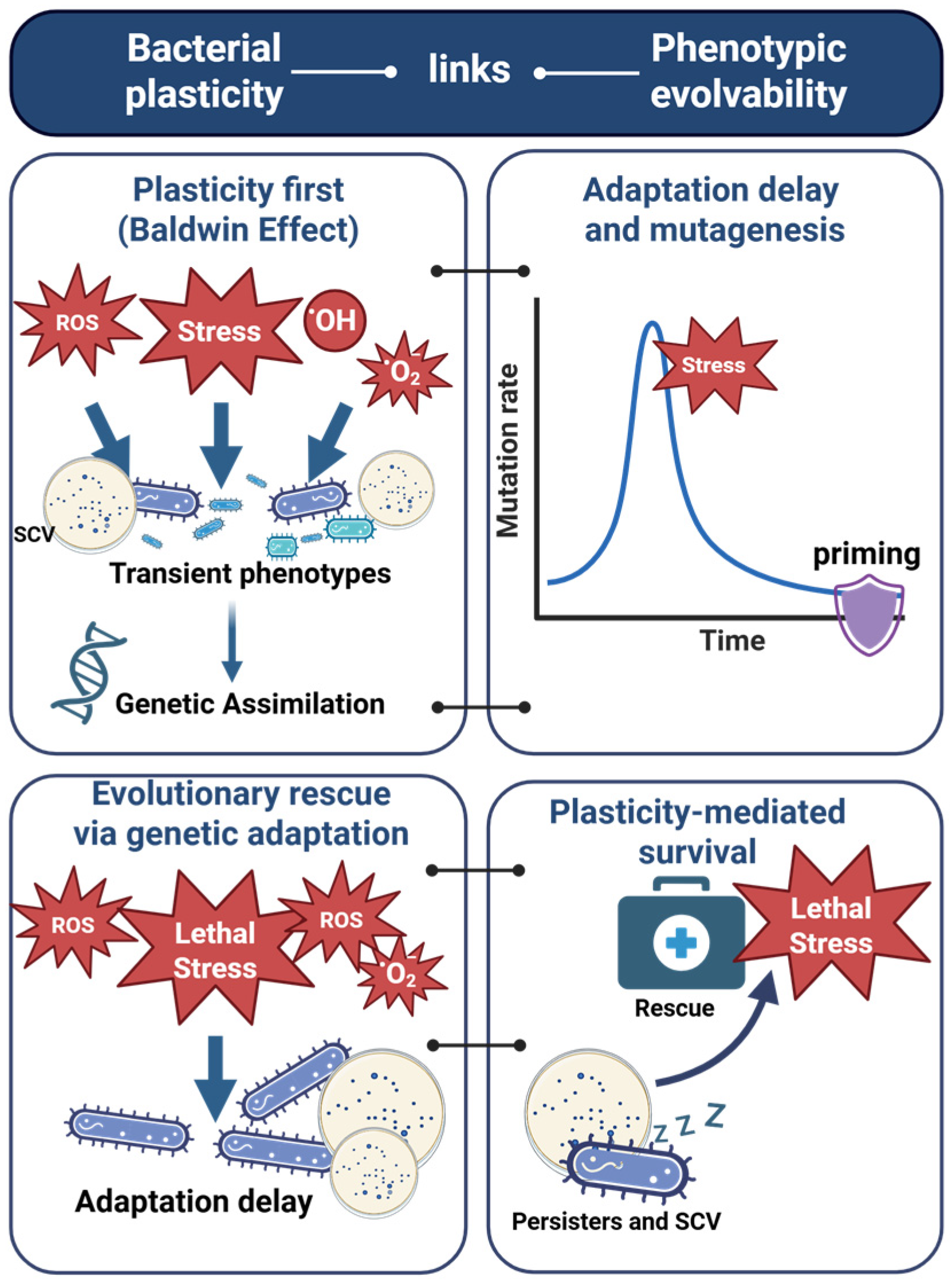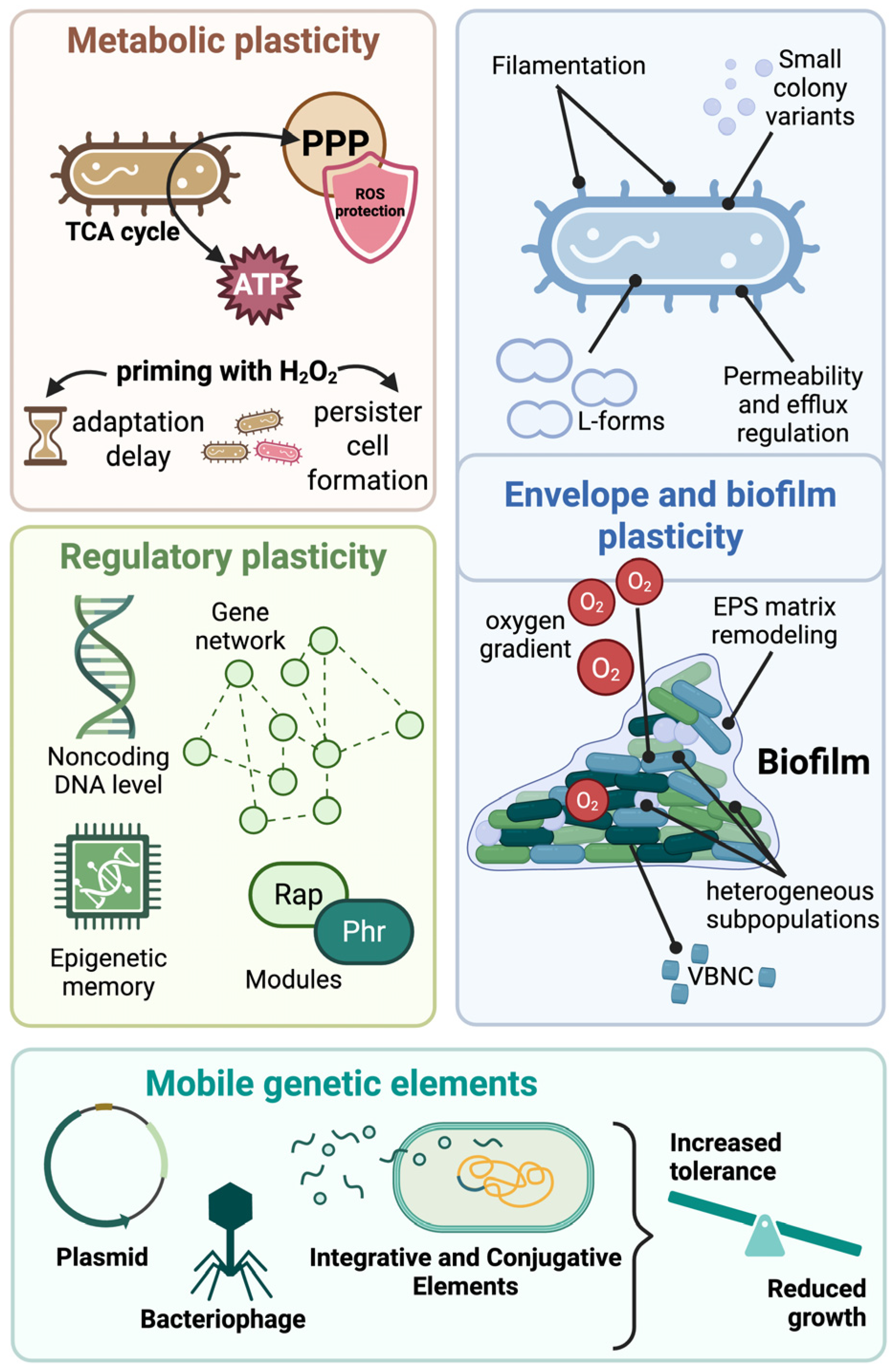 | Phenotypic plasticity | Regulatory, metabolic, physiological | Yes | Heterogeneous, dynamic | Context- dependent | Framework encompassing tolerance, persistence and resilience | [9,25,26,27] |