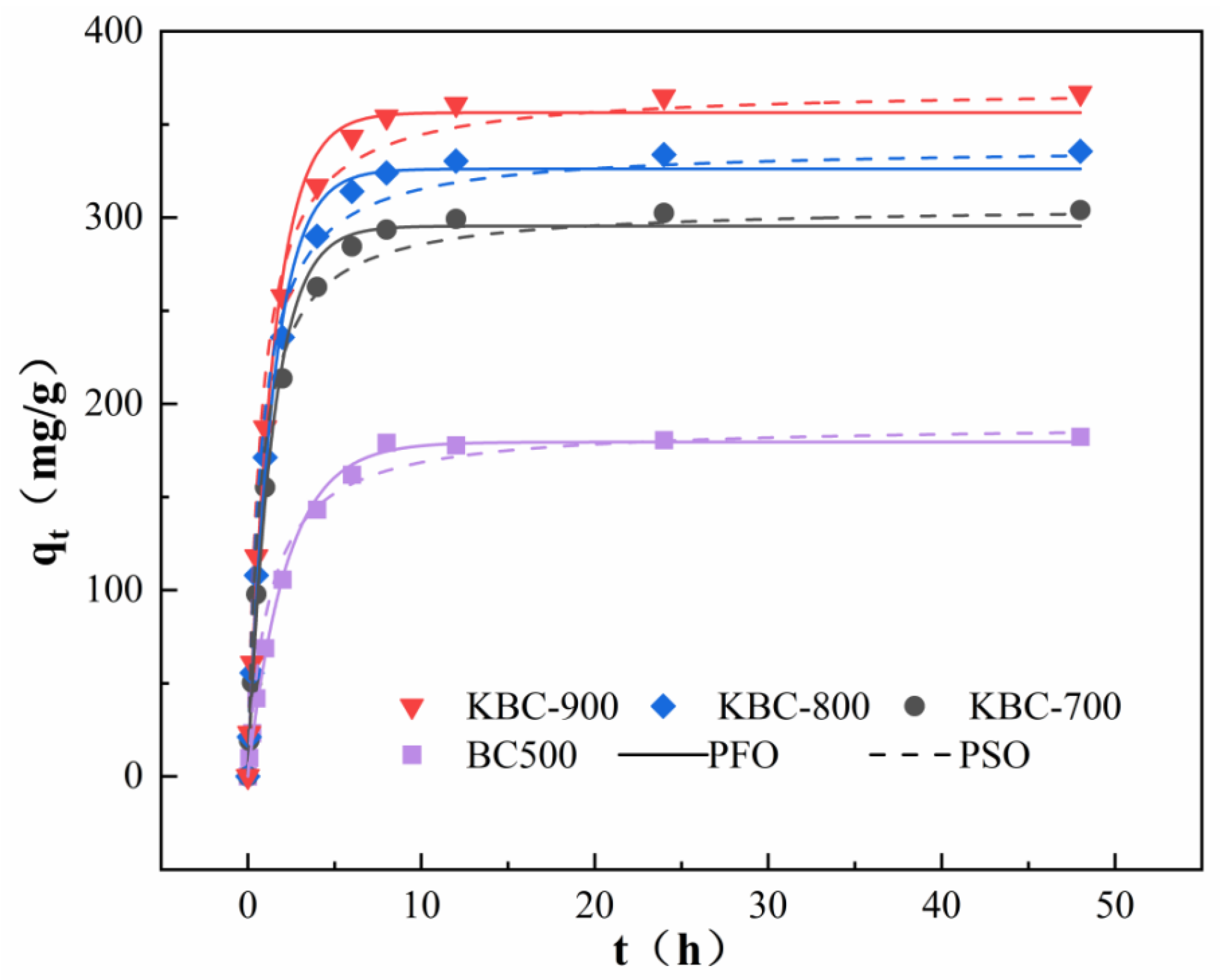 | Pseudo-first-order | qe (mg g−1) | 299.41 | 329.08 | 362.31 |