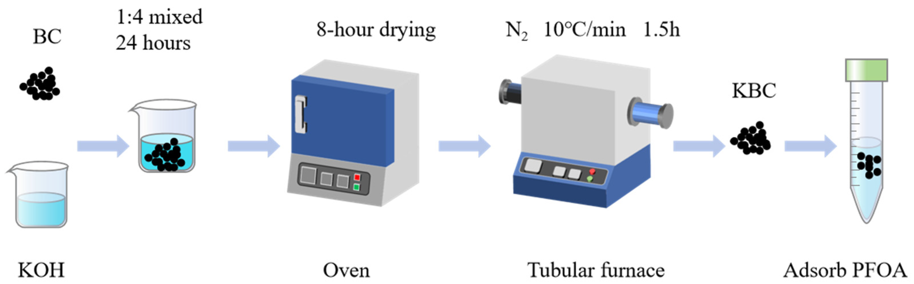- Zhou, Y.; Xu, M.; Huang, D.; Xu, L.; Yu, M.; Zhu, Y.; Niu, J. Modulating Hierarchically Microporous Biochar Via Molten Alkali Treatment for Efficient Adsorption Removal of Perfluorinated Carboxylic Acids from Wastewater. Sci. Total Environ. 2021, 757, 143719. [Google Scholar] [CrossRef] [PubMed]
