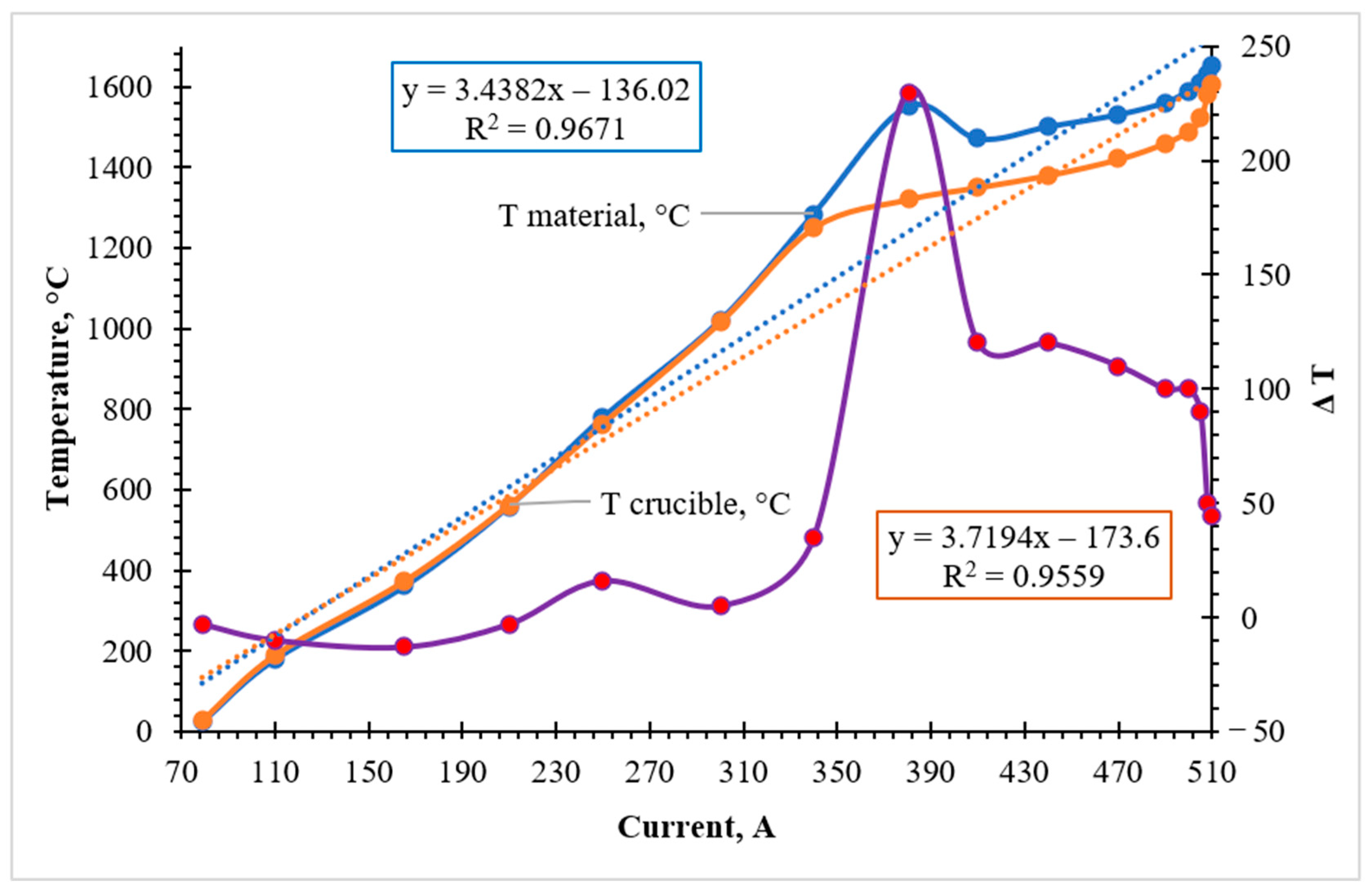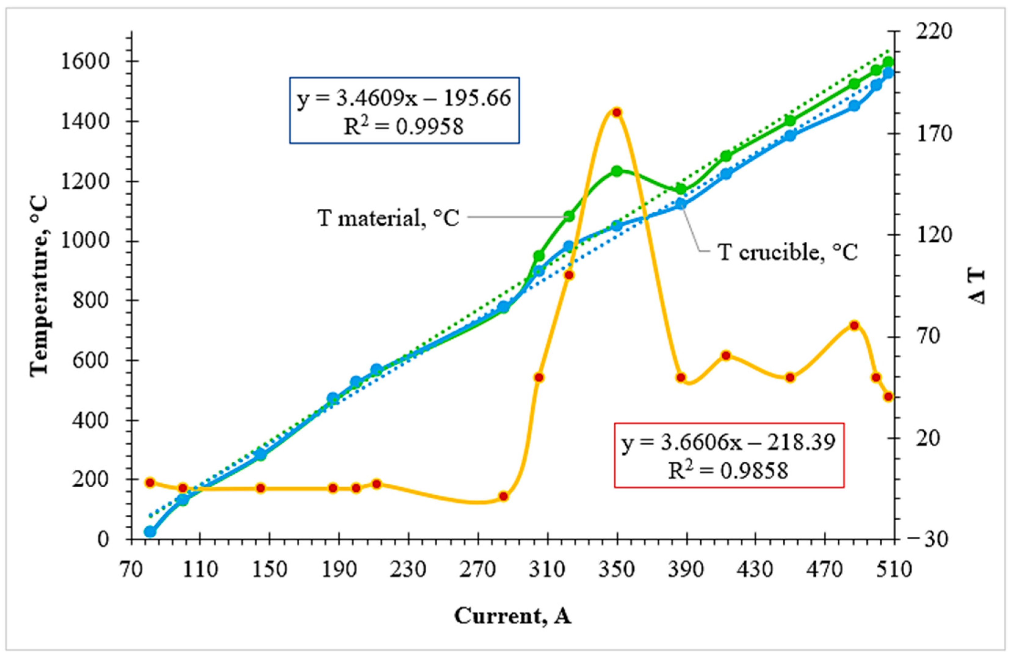 Figure 5). Up to a current of approximately 290 A, the heating followed a stable linear trend, governed predominantly by the external induction energy input.