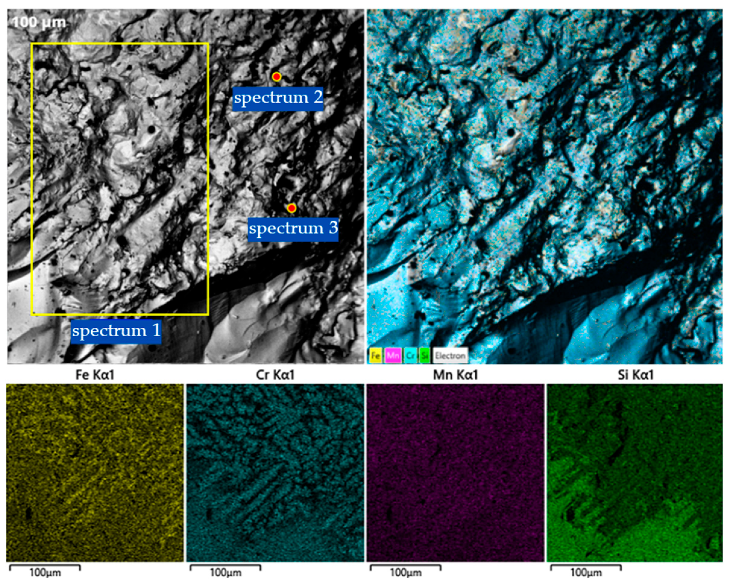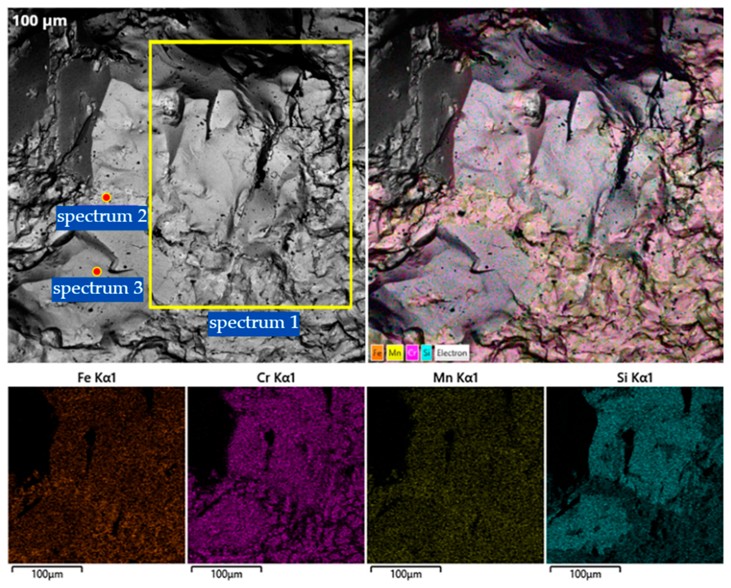 Spectrum 3 (Fe-Cr-Mn balance): This area shows a more balanced distribution of iron (29.11 wt.%) and chromium (44.39 wt.%) with high manganese (22.51 wt.%), confirming the presence of the complex Fe–Mn and BCC α-Fe based solid solutions.