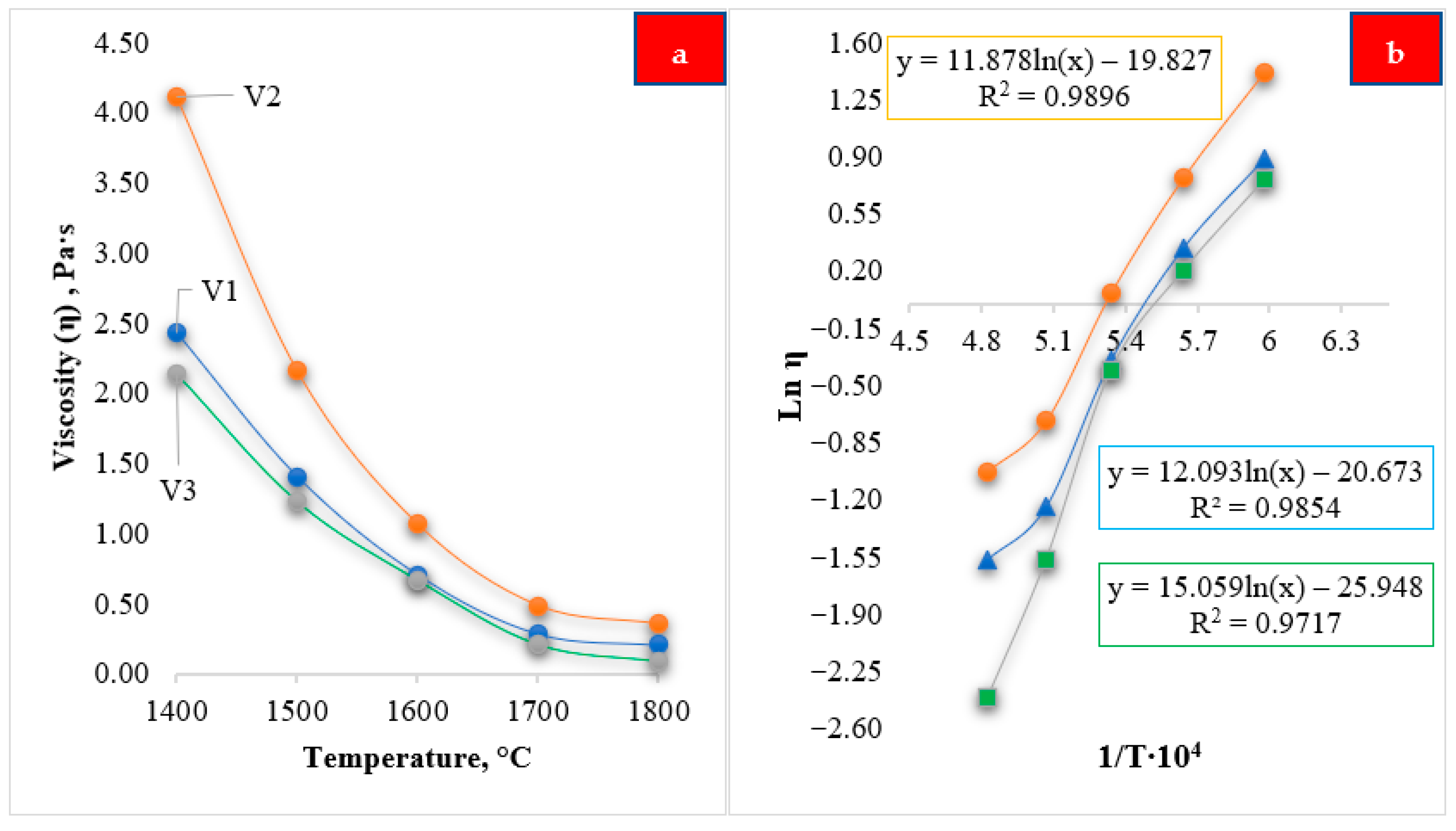 Figure 10a, the viscosity of all investigated slags decreases monotonically with increasing temperature, which is a characteristic feature of oxide melts. This behavior is associated with the gradual thermal disruption and depolymerization of the oxide structural network, leading to increased mobility of structural units and ions in the liquid phase. Among the studied compositions, slag V2 exhibits the highest viscosity values over the entire investigated temperature range, whereas slags V1 and V3 show lower viscosities, indicating differences in their chemical composition and structural organization.