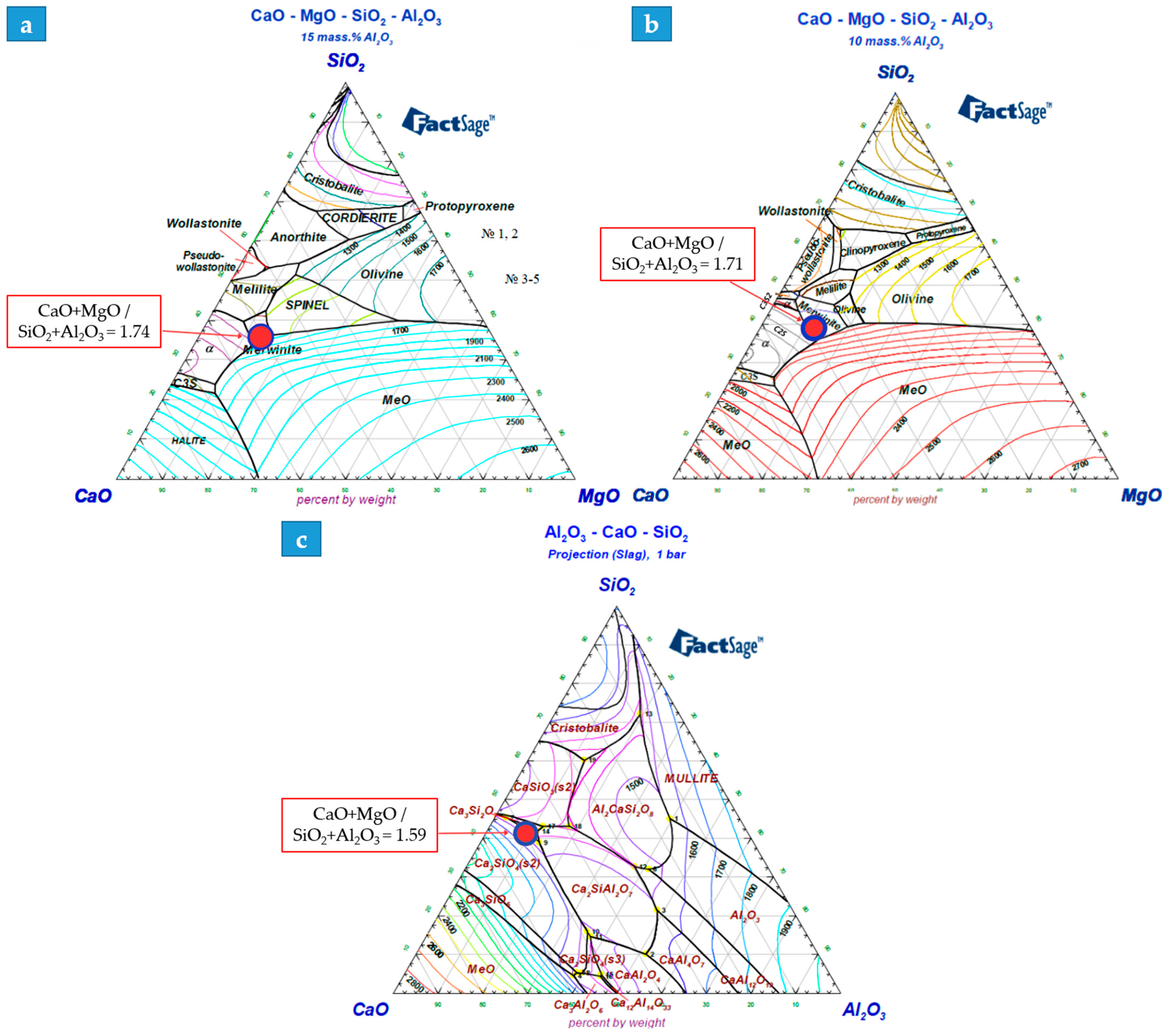 Figure 12a–c). The analysis shows that Variant 1 (V1) is located at the boundary of the Merwinite/Periclase fields, with a liquidus temperature in the range of 1550–1600 °C. This positioning within a relatively fluid mineralogical zone explains its stable viscosity at operating temperatures.