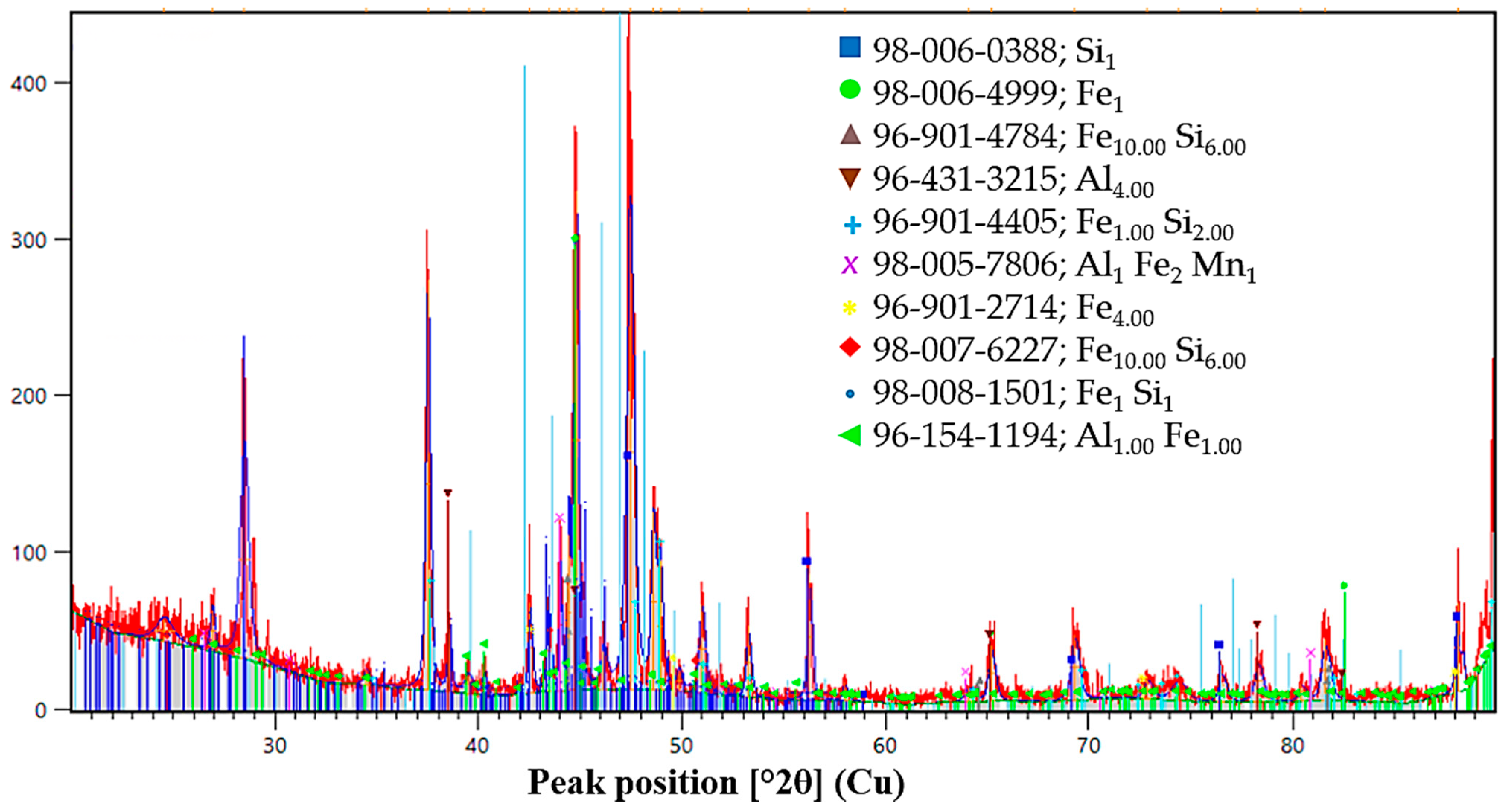Compared to Variant V1, Variant V2 exhibits a more pronounced development of iron–chromium and iron–chromium–silicon silicide phases, including Cr0.3Fe2.7Si, ε-FeSi, and Fe5Si3 (xifengite). These phases are identified by multiple reflections in the 38–42°, 50–55°, and 70–80° regions. The occurrence of Fe–Mn–Si silicides and trace manganese-containing phases indicates partial participation of manganese in silicide formation rather than extensive incorporation into the Fe lattice. This phase composition suggests a stronger influence of silicon-driven reactions and a higher degree of chemical heterogeneity in the metallic product.