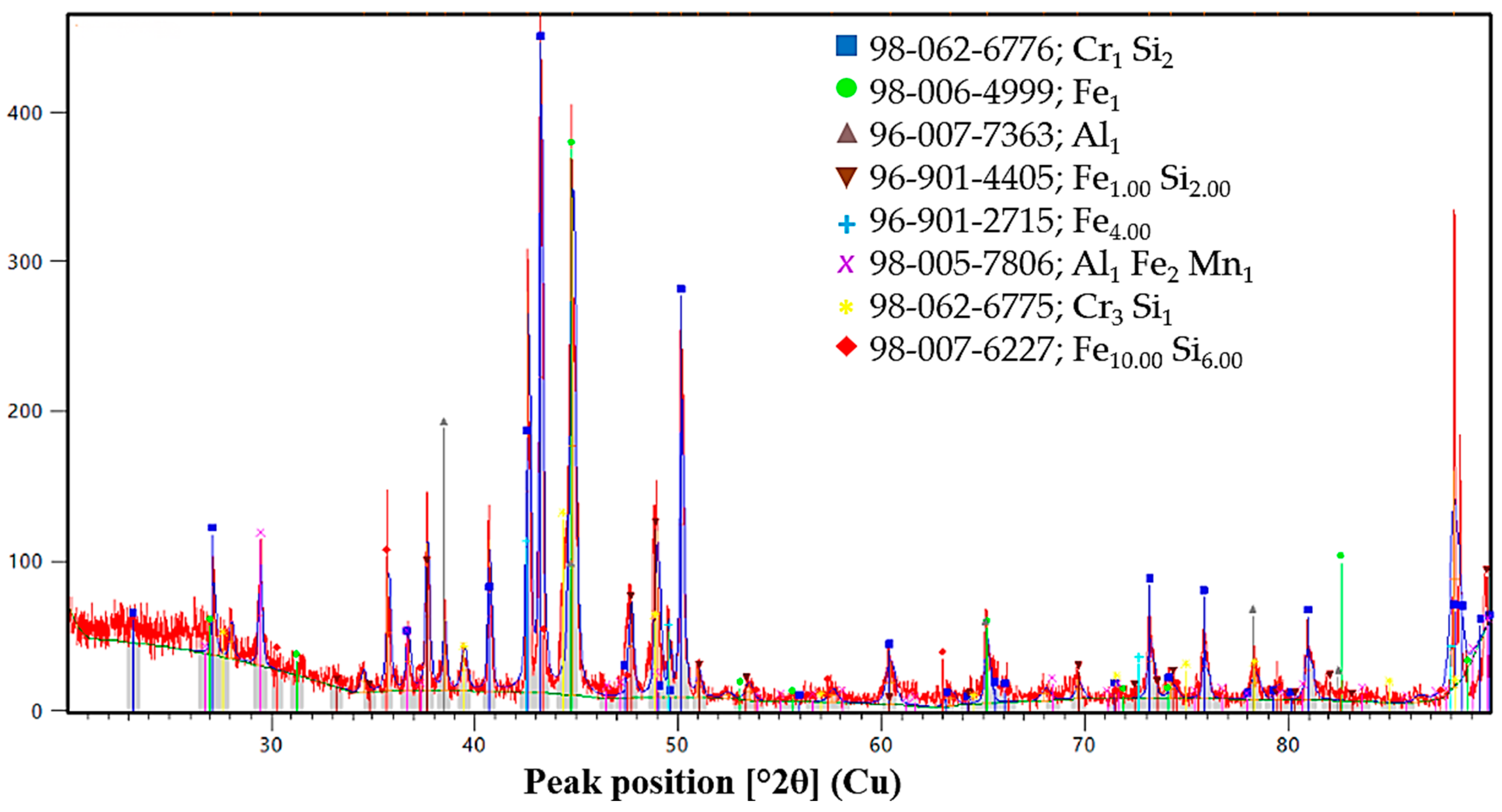 Only weak reflections corresponding to FeSi and Fe3Si are detected, suggesting limited interaction between silicon and the metallic melt under the thermal conditions of Variant V3. The absence of pronounced Cr3Si or complex Fe–Mn–Si silicides implies a more equilibrium-like crystallization behavior and a lower degree of chemical segregation during solidification.