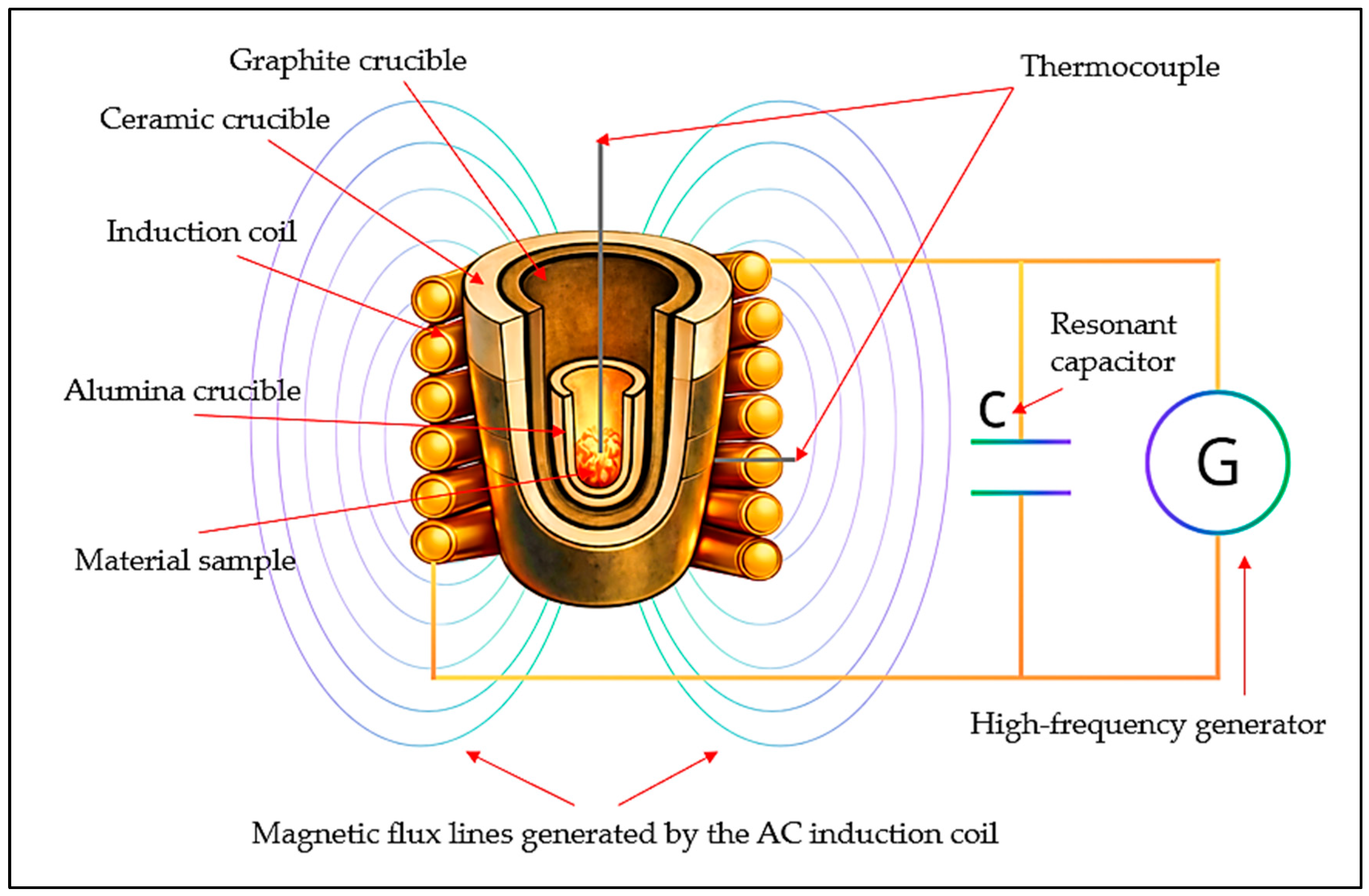 The temperature in the furnace working zone was monitored using a tungsten–rhenium thermocouple protected by a corundum sheath, with the measuring junction positioned in close proximity to the crucible bottom, ensuring high accuracy of melt temperature determination.