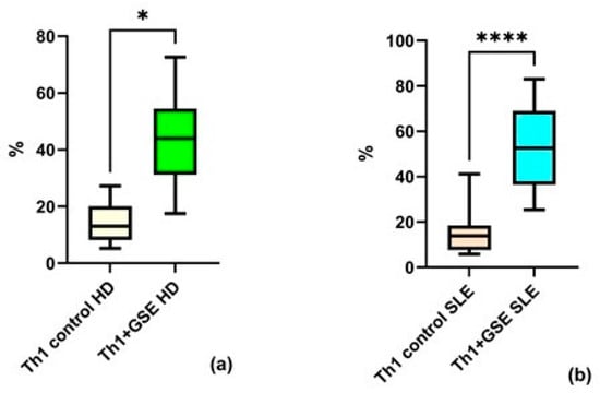 Flow-cytometric analysis of the Th1 subpopulation within the T-helper population: (a) a statistically significant increase in Th1 cells cultured with GSE is observed compared with the control cells in healthy donors (HD); (b) a statistically significant increase in Th1 cells cultured with GSE is observed compared with the control cells in patients with SLE. In the control PBMC of both groups, the percentage of Th1 cells is comparable. Upon exposure to GSE, this percentage increases to 43.86% ± 17.95 (* p = 0.01) in healthy donors and to 52.67% ± 18.62 (**** p = 0.0001) in patients with SLE.