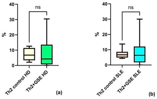 Flow-cytometric analysis of the Th2 subpopulation within the T-helper population: (a) no statistically significant (ns) increase in Th2 cells cultured with GSE is observed compared with control cells in healthy donors (HD); (b) no statistically significant increase in Th2 cells cultured with GSE is observed compared with control cells in patients with SLE. In the control PBMC of both groups, the percentage of Th2 cells within the T-helper population is similar. Exposure to polyphenols did not result in a significant increase in Th2 cells in either healthy donors (p = 0.8438) or SLE patients (p = 0.9999).