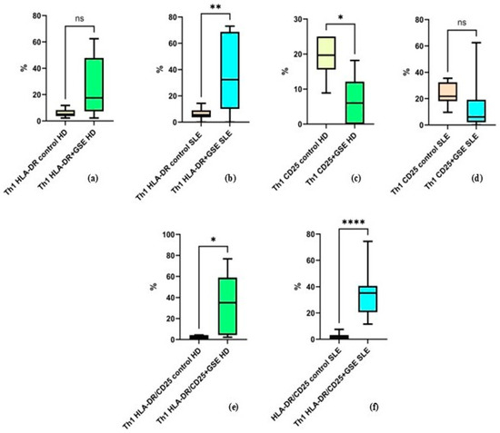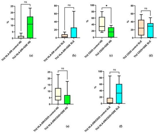 The mean values for the other examined groups were as follows: in healthy donors, the percentage of HLA-DR+ Th2 cells was 0.8% ± 1.6 in control cells and 10.04% ± 9.04 in GSE-treated cells (p = 0.1250); in SLE patients, HLA-DR+ Th2 cells accounted for 4.36% ± 5.07 in controls and 14.76% ± 24.80 after GSE treatment (p = 0.3008). For CD25+ cells in SLE patients, the percentages were 25.39% ± 20.22 in controls and 22.92% ± 19.09 following GSE treatment (p = 0.6484). Regarding cells double-positive for CD25/HLA-DR, healthy donors exhibited 8.03% ± 8 in controls and 3.62% ± 7.08 after GSE treatment (p = 0.4375), while SLE patients showed 13.59% ± 25.84 in controls and 34.07% ± 30.70 following GSE exposure (p = 0.0977).