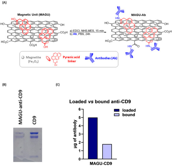 Specific evidence of graphene surface derivatization was provided by thermal gravimetric analysis (TGA). The GO thermal profile shows two main weight-loss processes: the first from 100° to 200° C due to the CO, CO2, and steam release from the most labile functional groups; and the second from 200° to 340° C related to the degradation of the most stable functional groups. The subsequent slow degradation is ascribed to the pyrolysis of the carbon skeleton [29]. In contrast, MG shows much higher thermal stability with a first weight-loss step from 100° to 230° C, followed by a constant degradation up to 800° C. The thermogram of MG is comparable with that of the reduced graphene platform obtained in our previous works [30,31], confirming the success of the co-precipitation strategy in partially restoring the sp2 graphene network. Additionally, the MAGU sample exhibits higher thermal stability between 100 °C and 650 °C, likely due to PA absorption onto the graphene surface via π-π stacking interactions [22] (Figure 2B). MAGU were conjugated to Ab using carbodiimide chemistry. Specifically, EDC in the presence of NHS activated the carboxyl groups on the MAGU surface for subsequent conjugation with the amine functionalities on antibodies (Figure 3A). Therefore, MAGU were weighed, activated, and subsequently incubated overnight at 4 °C with 5 μg of anti-CD9 antibodies under continuous rotation (Figure 3B). The next day, MAGU-anti-CD9 were washed with PBS and analyzed by SDS-PAGE as detailed in Section 4. Free anti-CD9 antibody (5 μg) was used as a control. Coomassie Brilliant Blue staining revealed a clear antibody band in the MAGU-anti-CD9 lane, confirming the successful covalent attachment of the anti-CD9 to MAGU (Figure 3B). Densitometric quantification, using the free anti-CD9 antibody bands as a control, indicated that approximately 1.8 µg of antibodies, corresponding to ~36% of the total 5 µg loaded, was effectively bound to the magnetic carrier (Figure 3C).