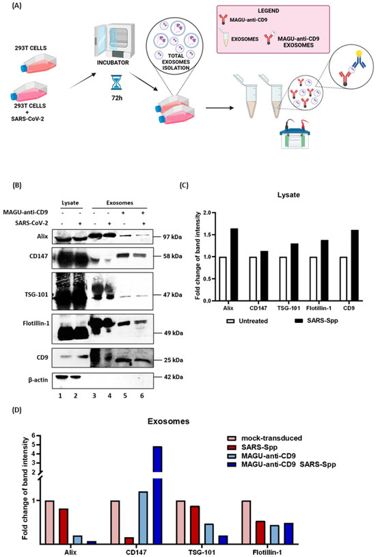 Isolation and analysis of exosomes from SARS-CoV-2 pseudovirus transduced 293T cells by MAGU-anti-CD9. (A) Schematic representation of the experimental procedure for pseudovirus transduction, exosome extraction, and incubation with MAGU-anti-CD9. (B) Western blot analysis of exosomal markers. (C) Quantification of protein levels of each marker in cell lysates from untreated or SARS-Spp-transduced 293T cells. (D) Quantification of protein levels of each marker in exosomes isolated using MAGU-anti-CD9 compared to exosome control. Panel A was created in https://BioRender.com.