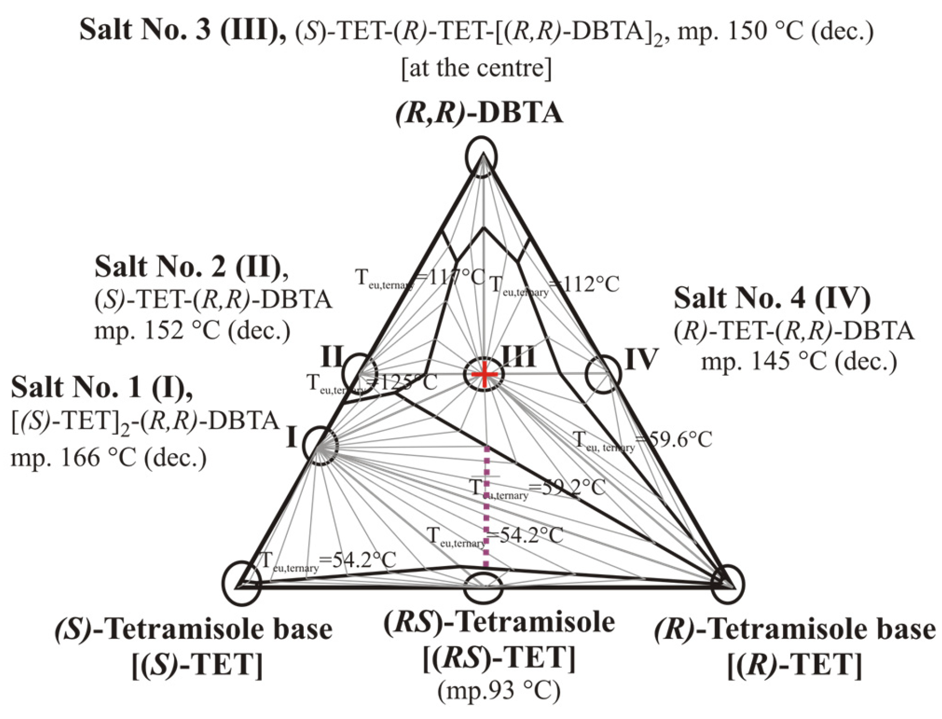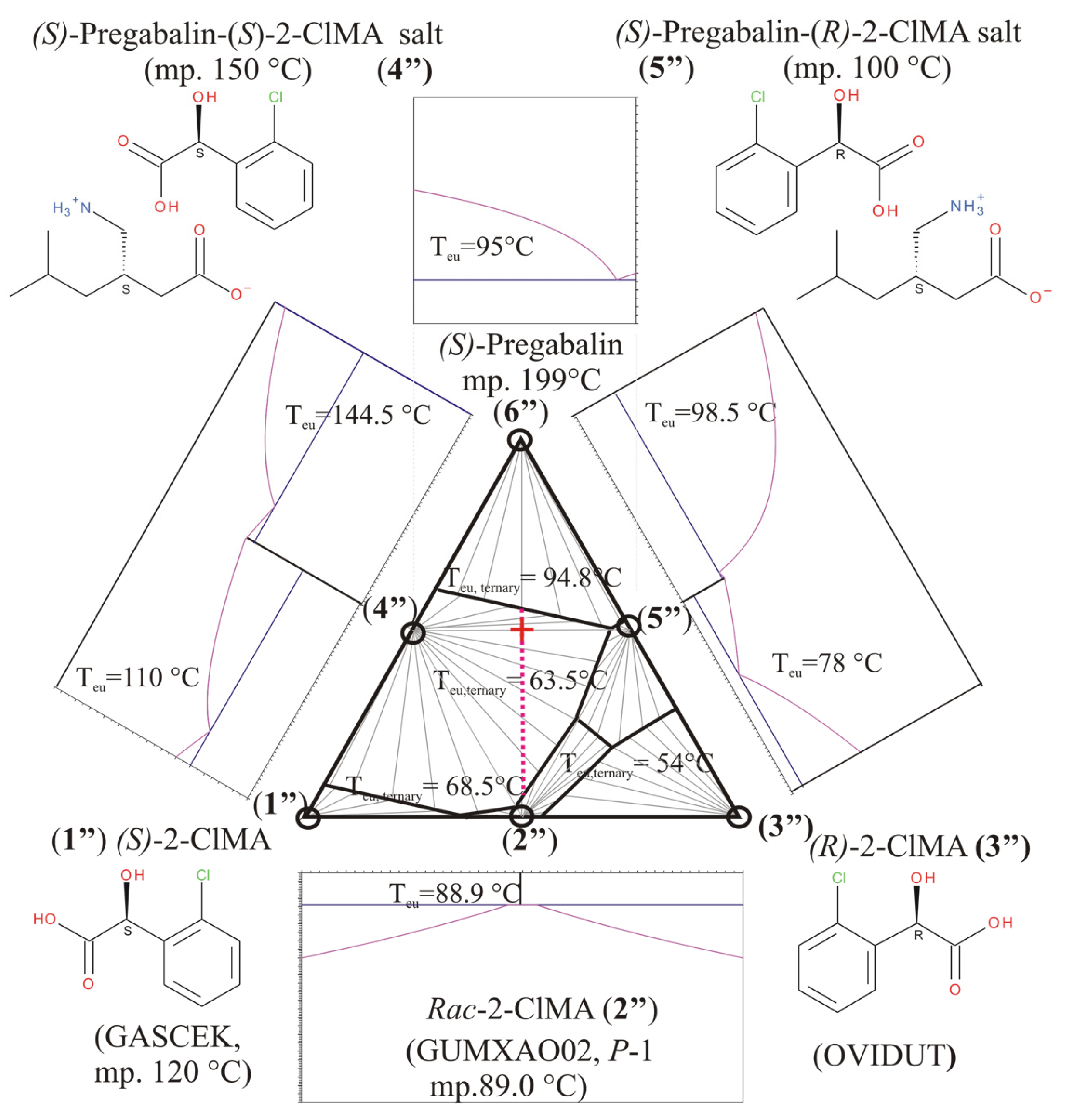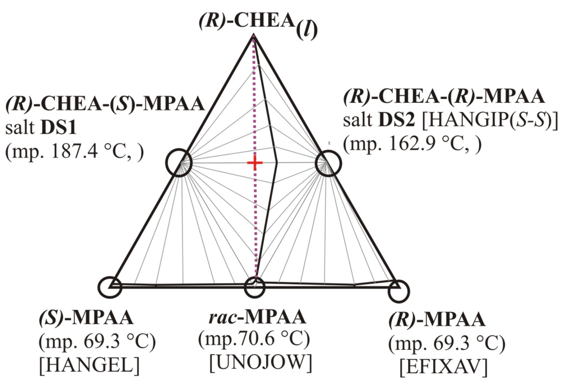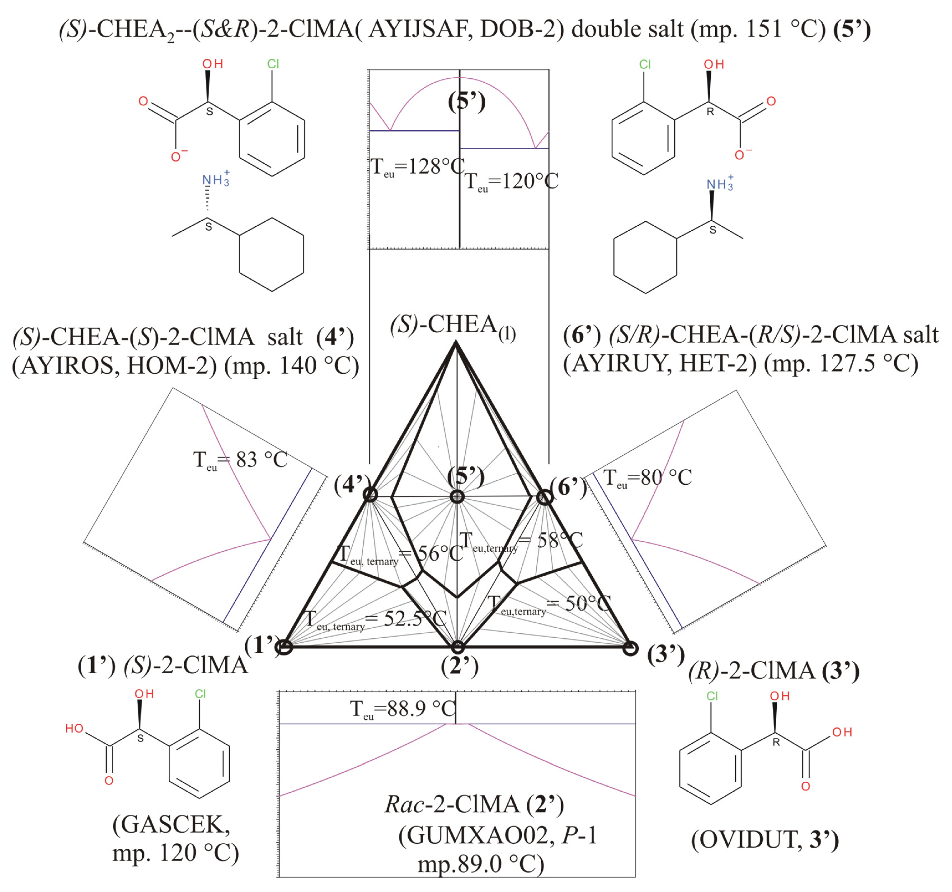 - Kozma, D.; Pokol, G.; Ács, M. Calculation of the efficiency of optical resolutions on the basis of the binary phase diagram for the diastereoisomeric salts. J. Chem. Soc. Perkin Trans. 2 1992, 3, 435–439. [Google Scholar] [CrossRef]