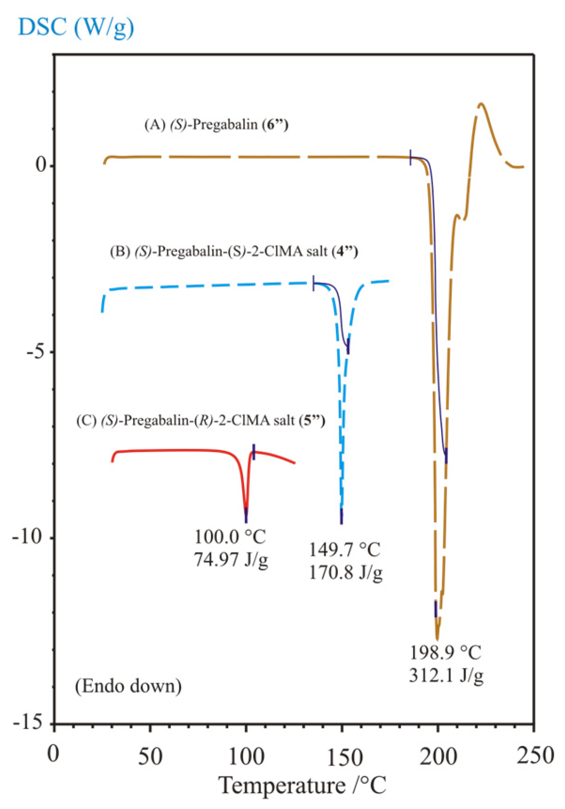 - Madarász, J.; Pokol, G.; Ács, M.; Fogassy, E. Merit of estimations from DSC measurements for the efficiency of optical resolutions. J. Thermal. Anal. Calorim. 1994, 42, 877–894. [Google Scholar] [CrossRef]