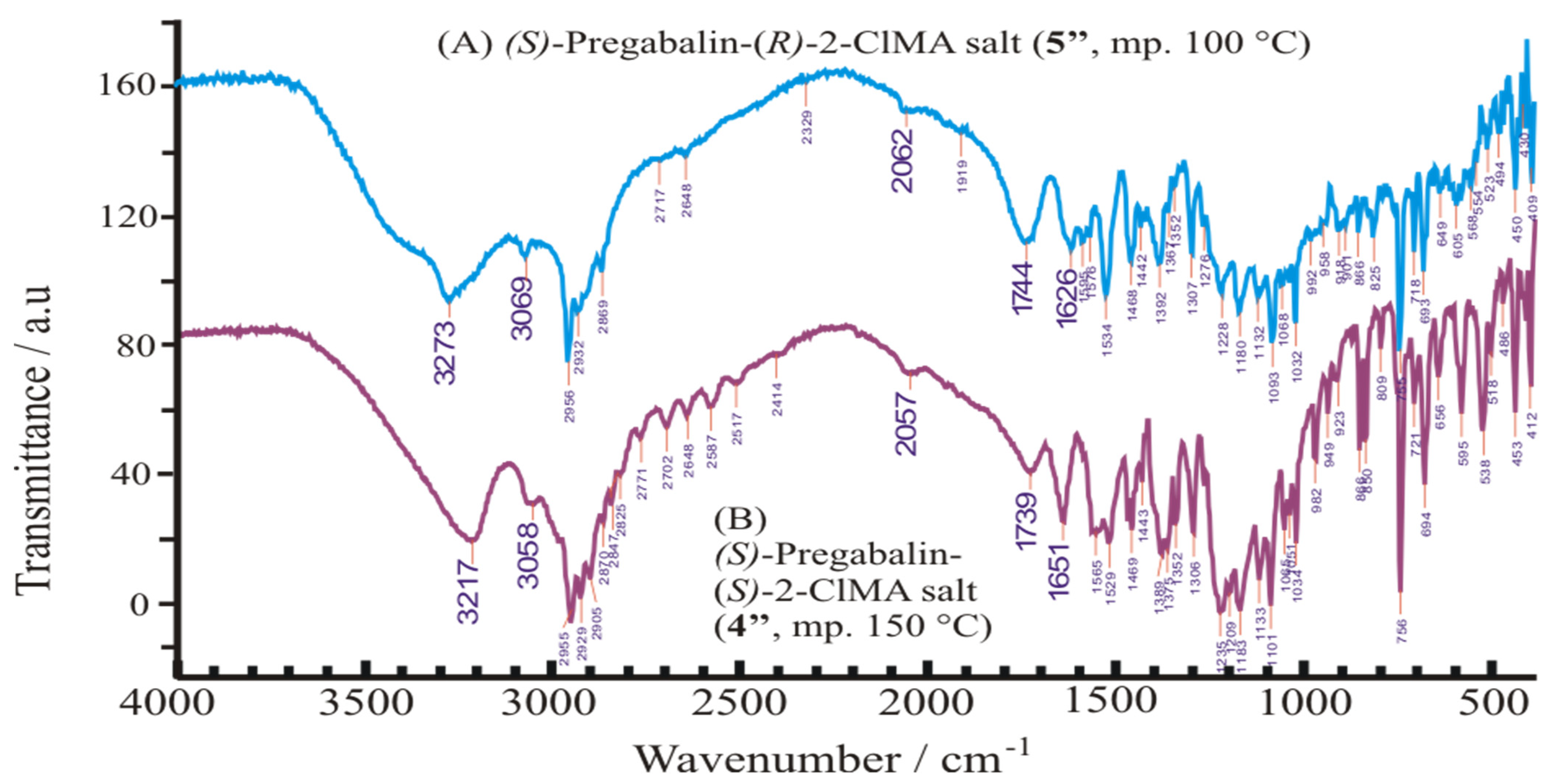 2.2.2. Powder XRD Patterns and FTIR Spectra of the Pure Diastereomeric Salts (4″ and 5″)