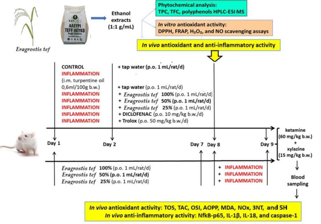 Ferențiu I, Pop TI, Pârvu AE, Morar II, Bolunduț D, Pârvu M, Ranga F, Dalai CO, Țicolea M, Pop RM. White Teff Flour Ethanolic Extract: Phytochemical Profile, Antioxidant and Anti-Inflammatory Activity. Molecules. 2026; 31(4):644. https://doi.org/10.3390/molecules31040644