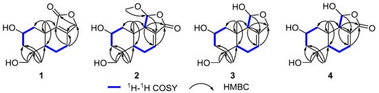 Key 1H–1H COSY and HMBC correlations of 1–4.