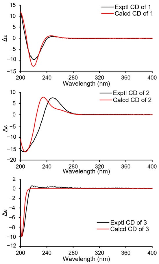 Measurements of optical rotations were carried out with an Autopol IV-T digital polarimeter (Rudolph, Hackettstown, NJ, USA). UV and CD spectra were obtained on a Hitachi UH5300 spectrophotometer (Hitachi, Tokyo, Japan) and a Chirascan Circular Dichroism Spectrometer (Applied Photophysics Limited, Leatherhead, Surrey, UK), respectively. NMR data, including both 1D and 2D spectra, were recorded on a Bruker Avance III 600 MHz spectrometer (Bruker Corporation, Karlsruhe, Germany). High-resolution mass spectrometry (HRESIMS) measurements were performed using a Q Exactive Orbitrap mass spectrometer (Thermo Fisher Scientific, Waltham, MA, USA). Preparative high-performance liquid chromatography (prep-HPLC) was conducted on an Agilent 1260 Infinity II system, equipped with a Zorbax SB-C18 column (particle size: 5 μm, dimensions: 9.4 mm × 150 mm or 7 μm, 21.1 mm × 250 mm) and a DAD detector (Agilent Technologies, Santa Clara, CA, USA). For column chromatography (CC), silica gel (200–300 mesh, Qingdao Haiyang Chemical Co., Ltd., Qingdao, China) and Sephadex LH-20 (GE Healthcare, Upplasa, Sweden) were employed.